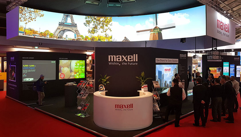 MAXELL exhibit at ISE held at the RAI in Amsterdam. These custom-built exhibition stands showcase the very best of Hitachi’s range of projectors. The stands were produced to a height of 6 meters and utilising the latest in tensile fabric construction methods, we were able to achieve a variety of different large format projection surfaces.
