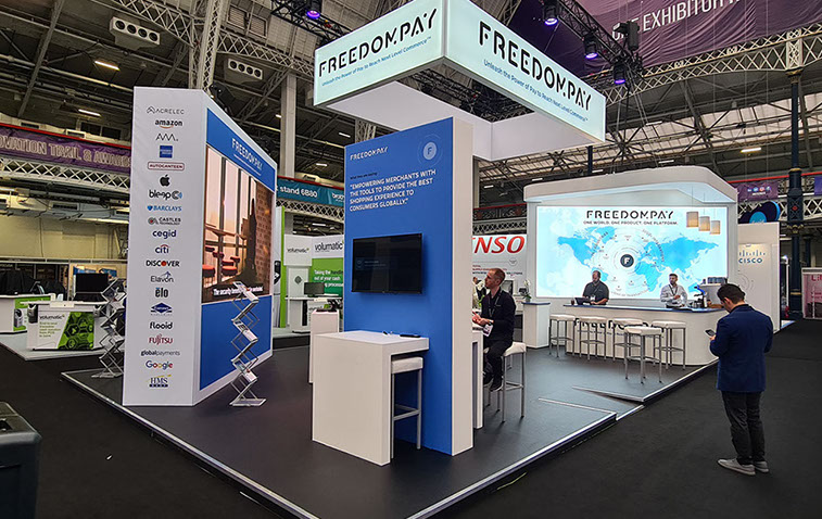 The FreedomPay stand was designed and due to be delivered back in 2020 just as the pandemic hit. So we put everything on hold until the Retail Expo show was reinstated in 2022. The fully custom built stand contained a fully illuminated header structure and lighting rig, a bar, a presentation suite, 6 square metres of video wall, reception desk.