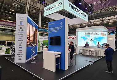 The FreedomPay stand was designed and due to be delivered back in 2020 just as the pandemic hit. So we put everything on hold until the Retail Expo show was reinstated in 2022. The fully custom built stand contained a fully illuminated header structure and lighting rig, a bar, a presentation suite, 6 square metres of video wall, reception desk.